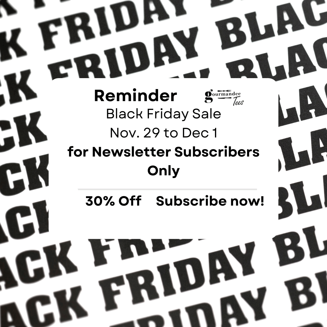 This Black Friday, Gourmandee Tees’ VIPs save BIG! 🍾 Join our newsletter now to unlock your exclusive 30% off. Sip, savor, and save – this discount is only available to subscribers, so don’t miss out on your favorite foodie apparel!